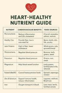 | Magnesium | 300–500 mg/day | Reduces risk of stroke and atrial fibrillation | Nuts, seeds, whole grains, leafy greens |